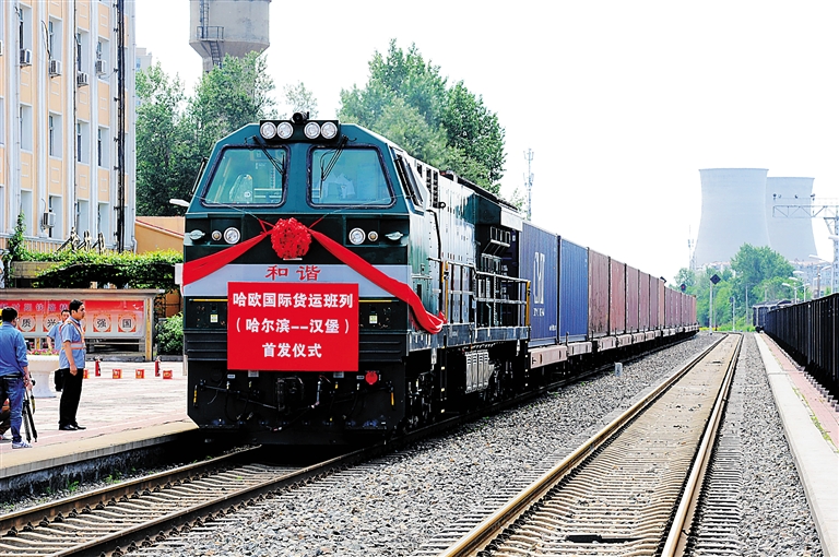 6月13日,首列“哈欧国际货运班列”即将出发。 6月13日,首列“哈欧国际货运班列(哈尔滨-汉堡)”从哈尔滨开出,将从满洲里出境,经俄罗斯、波兰等国,终点为德国汉堡,全程9820公里,预计7月11日返回哈尔滨。这标志着又一条连接中国至俄罗斯及其他欧洲国家的贸易物流通道正式贯通。 列车装载49个集装箱,货物主要包括电子元器件、液晶显示屏零部件、汽车零部件、小机电产品等15类产品,总货值为300万美元。