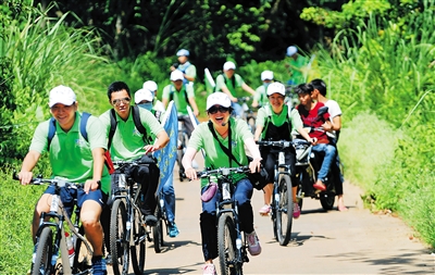 6月13日,共青团海口秀英区委组织开展青春骑行活动,近百名青年志愿者骑上自行车,来到羊山地区石山镇的美社村、荣堂村等林间小道,徜徉绿海深处,领略火山地貌的生态之美,调动大家积极投身文明生态村建设活动。