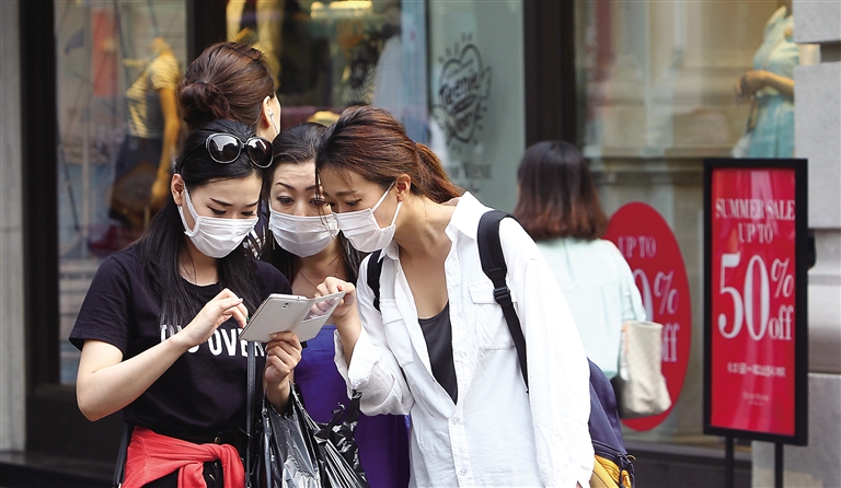 6月16日,在韩国首尔,人们在明洞商业区购物。根据韩国旅游发展局最新数据,逾十万外国游客因中东呼吸综合征(MERS)疫情取消赴韩旅行。 新华社记者 姚琪琳 摄