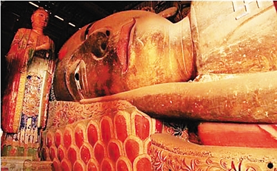 进入正门,再进入中轴线上的大佛殿,佛祖释迦牟尼的涅槃像优雅地侧卧在我们眼前,金装彩绘,形态逼真,视之若醒,呼之则寐。