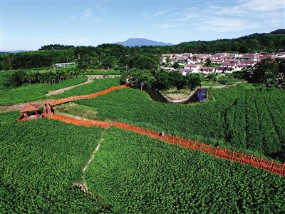 6月16日,在琼中黎族苗族自治县湾岭镇岭脚村,成片桑田郁郁葱葱,一条观光栈道穿田而过。该村目前种植桑叶400多亩,今年的首批桑叶已经采摘完毕,第二批桑叶正在生长。