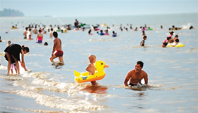 近日,天气持续高温,海口市的海边慢道、公共海滩为市民提供了最佳的消暑场所。图为人们在西海岸的假日海滩戏水消暑。