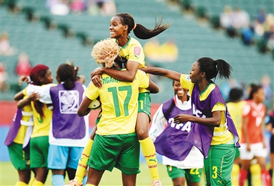 女足世界杯C组17日收官,喀麦隆队以2:1击败瑞士队,获得小组第二,将成为中国队的十六强赛的对手。图为喀麦隆队队员庆祝胜利。 新华社发