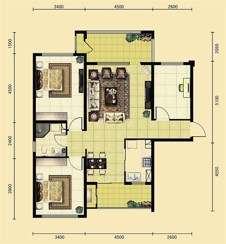 A户型3房2厅,签约建筑面积约为93.65㎡,实际面积约120㎡。24.5㎡的赠送面积主要体现在入户门右侧的多功能房间和南北双阳台。4.5米大开间的客厅与餐厨南北贯通,公共空间舒适便捷。此外,专家公寓还赠送全装修。匹配专家学者高端客群的层次,精装修除了聘请海外设计师亲自操刀主创外,更是以极高的精装修标准交付。