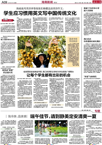 “从今年的英语高考作文来看,我们的中小学英语教学,应该在英语的课堂上传播中国文化。”昨天上午,2015年海南高考英语评卷组组长杨蕾达教授表示,每个中小学生在学习中,要习惯用英文来写中国的传统文化、中国的国情。