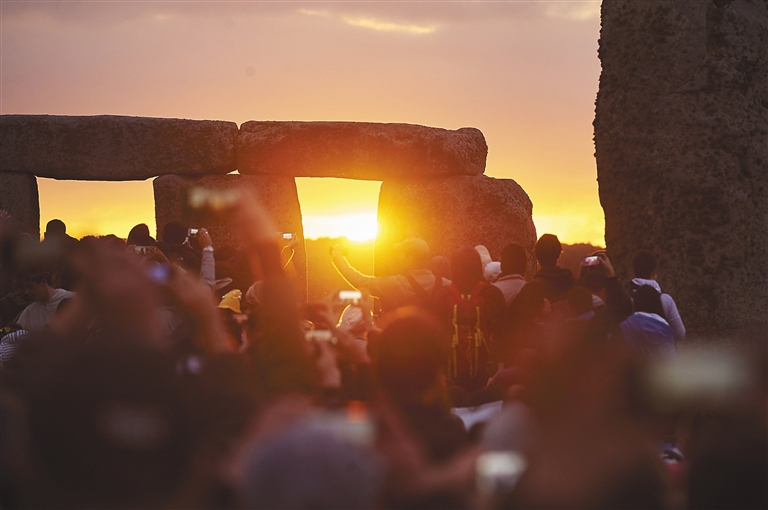 6月21日,在英国威尔特郡,人们聚集在巨石阵观看日出,迎接夏至日。 巨石阵位于距英国首都伦敦137公里的索尔兹伯里平原上,是联合国教科文组织认定的世界文化遗产。巨石阵由环状排列的巨石和环状沟组成,其年代可追溯至公元前2550年。 新华社/法新