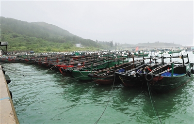 6月22日下午,强热带风暴“鲸鱼”登陆前,万宁市乌场港渔船已全部靠岸,渔政工作人员正抓紧将渔船靠岸加固。 本报记者 王凯 特约记者 陈循静 摄