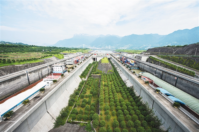 6月22日,船舶通过三峡双线五级船闸。 当日,从长江三峡通航管理局获悉,三峡船闸和葛洲坝船闸5月通过货运量双双破千万吨,与4月相比均有所增加。今年1至5月通过货运量与去年同期相比,均呈增长趋势。 新华社发