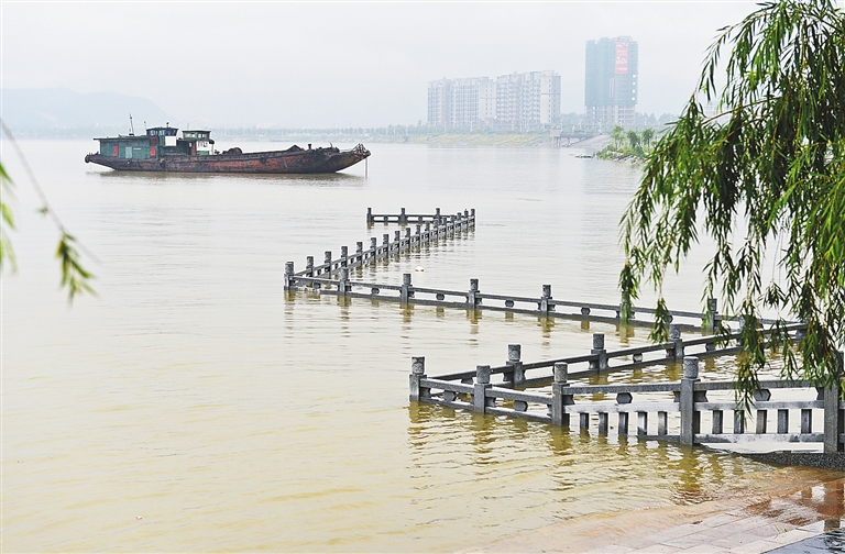 6月22日,位于星子县城的鄱阳湖观景台已被湖水淹没。 受新一轮强降雨影响,江西鄱阳湖水位持续上涨,截至当日14时,鄱阳湖星子站水位为19.34米,超过警戒水位0.34米,为近三年来最高水位。由于湖水持续上涨,江西省星子县6431亩农田受淹,防洪压力加大。 新华社发