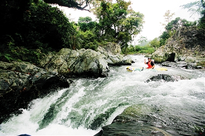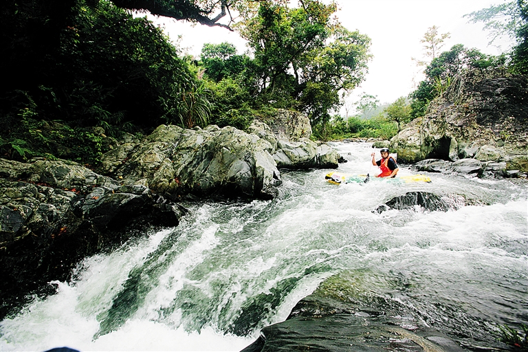 在水满乡,欣赏了山峰的奇秀,人们还能在大峡谷体验到河水的激情。经过千万年的山体运动和风雨冲刷,从五指山第一峰至雅宾草地,形成了一条纵深上千米的大峡谷。峡谷水流湍急,共有大小落差80多个,其中最大落差80米,最深水位8米,最斜水坡45度,最急流速每秒5米至8米,大小呈“S”型河流段多达100多个。