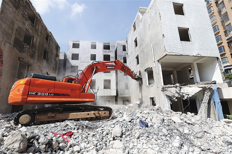 率先拆除的是该村临近三亚湾路与田独河交界处的一栋违建。这栋建筑总高5层,建筑面积近1.2万平方米,已建成168个房间,房屋墙壁一侧的招租广告十分显眼。在炮机高高扬起的铁锤下,很快就轰然倒下。执法人员介绍,这是吉阳区今年以来拆除的最大单体违建。该建筑自2013年10月兴建,至2014年建成。建设期间,执法人员下发相关法律文书并要求当事人提供正规报建手续材料,但建筑业主一直未露面,也未提供任何相关手续。