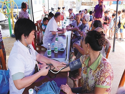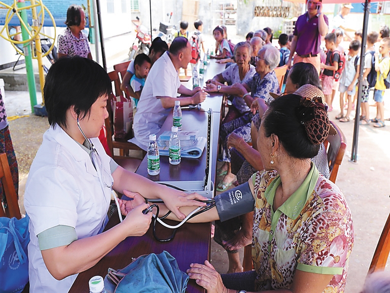 6月25日上午,海南边防总队“健康基层行”医疗服务小分队及陵水边防支队官兵来到陵水黎族自治县英州镇赤岭村,为群众进行免费健康体检,并上门开展诊疗服务。本报记者 武威 通讯员 夏勇 摄