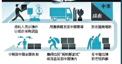 据相关人员介绍,最常见的走私路径是:走私人员从境外以低价采购货品,用集装箱发至香港,然后发往越南海防,在中越边境的芒街拆解,雇佣边民“蚂蚁搬家式”将冻品运到境内。一个35吨的集装箱冻品由几十个边民搬运,一两个小时就能搬完。