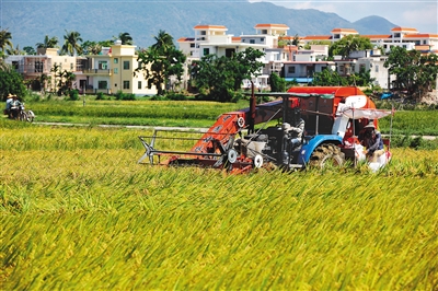 6月26日,农民驾驶收割机在三亚市天涯区槟榔河片区田间收割稻谷。