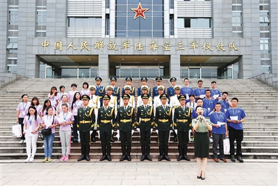 6月27日,三军仪仗队队员和参加活动的网友一起唱军歌。 当日,受中国军网、军报客户端、军报记者等解放军报新媒体邀请,20多名网友来到中国人民解放军陆海空三军仪仗队,亲身感受仪仗队官兵的训练生活。据介绍,这是三军仪仗队首次向网友开放。新华社发