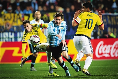 6月27日,在智利进行的2015美洲杯足球赛四分之一决赛中,阿根廷队通过点球大战以5:4战胜哥伦比亚队,晋级四强。 新华社发