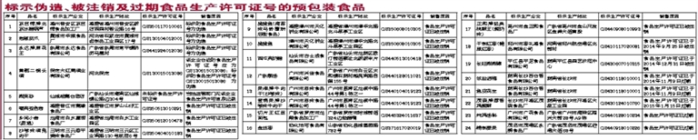今年5月,海南省食品药品监管部门对海口地区部分超市、批发市场和学校周边食品店等食品经营单位销售的预包装食品进行了检查,发现下列预包装食品标签标示的食品生产许可证号属伪造、被注销或已过期,经与标示产地的监管部门核实,确认为无证非法生产的产品。特此公告如下: