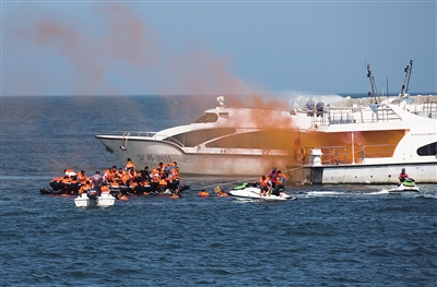 6月26日下午,陵水分界洲岛旅游区,在海上举行了一次演练。景区工作人员模拟在船舶机舱着火的情况下,如何进行应急处理、进行消防灭火并使用救生筏救生等,熟练掌握海上应急预案的流程。在旅游淡季,我省不少景区通过各种实战演练、业务培训等方式,加强内功,提高团队素养,做好旅游服务,备战旅游旺季。 本报记者 张杰 通讯员 童国强 摄