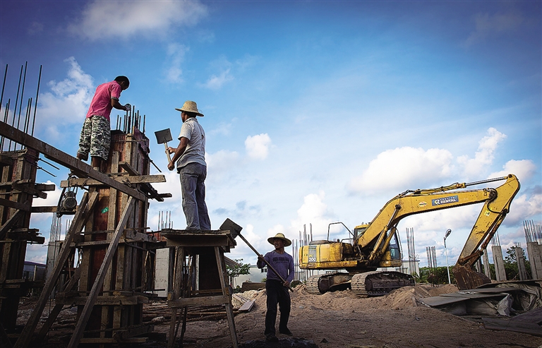 日前,三沙市赵述岛居民定居点施工现场,工人正在紧张施工中。