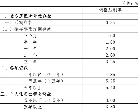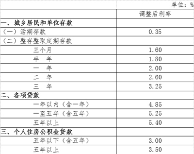 央行决定自2015年6月28日起下调金融机构人民币贷款和存款基准利率,其中,金融机构一年期贷款基准利率下调0.25个百分点至4.85%;一年期存款基准利率下调0.25个百分点至2%;其他各档次贷款及存款基准利率、个人住房公积金存贷款利率相应调整。