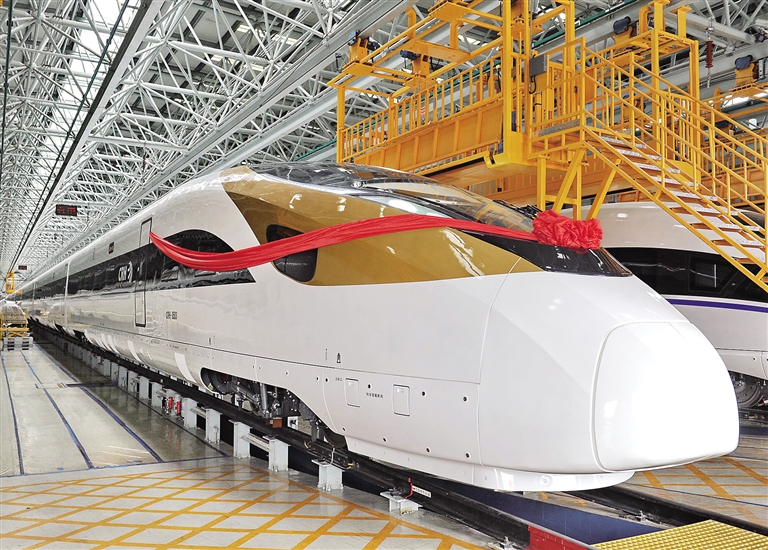 这是在中国中车长春轨道客车股份有限公司高速动车组制造中心拍摄的“中国标准”动车组列车(6月25日摄)。 6月30日,具有完全自主知识产权、时速350公里的“中国标准”动车组,在北京中国铁道科学研究院环形试验基地展开试验工作,这标志着中国标准动车组研制工作取得重要阶段性成果。