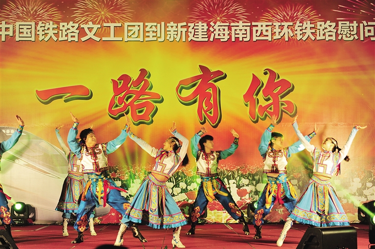 中国铁路文工团一行,日前来到海口慰问奋战在海南新建西环铁路一线的建设者。图为演出现场。本报记者 古月 通讯员 叶坚 摄