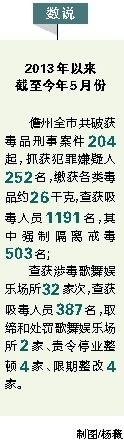 据统计,2013年以来,截至今年5月份,儋州全市共破获毒品刑事案件204起,抓获犯罪嫌疑人252名,缴获各类毒品约26千克;查获吸毒人员1191名,其中强制隔离戒毒503名;查获涉毒歌舞娱乐场所32家次,查获吸毒人员387名,取缔和处罚歌舞娱乐场所2家、责令停业整顿4家、限期整改4家。2013年、2014年,儋州均超额完成省下达的破毒案、抓毒贩任务。