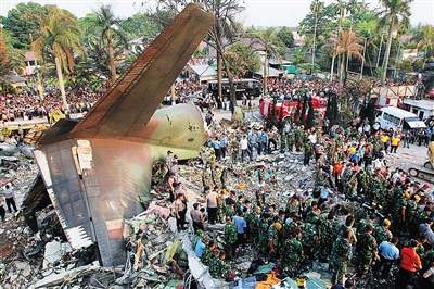 这是6月30日在印度尼西亚北苏门答腊省棉兰拍摄的坠机现场。 据外电报道,印度尼西亚警方7月1日说,6月30日发生在北苏门答腊省首府棉兰市的军用运输机坠机事件死亡人数已上升至141人。 新华社/法新
