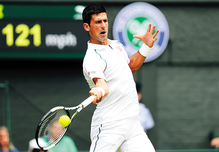 北京时间7月1日晚,在温网男单第二轮比赛中,头号种子塞尔维亚选手德约科维奇以3:0战胜芬兰选手涅米宁,进入第三轮。图为小德在比赛中回球。新华社发