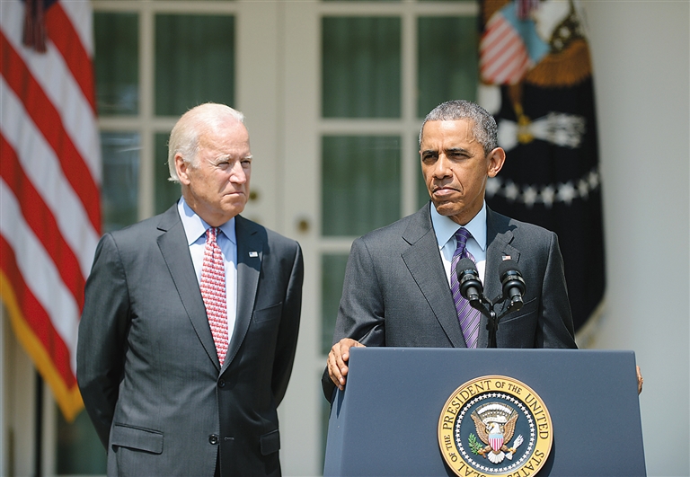 7月1日,在美国首都华盛顿白宫,美国总统奥巴马、副总统拜登出席记者会。 美国总统奥巴马7月1日在华盛顿宣布,美国已与古巴就恢复外交关系达成协议,两国将在7月20日互设大使馆。 新华社记者 殷博古 摄