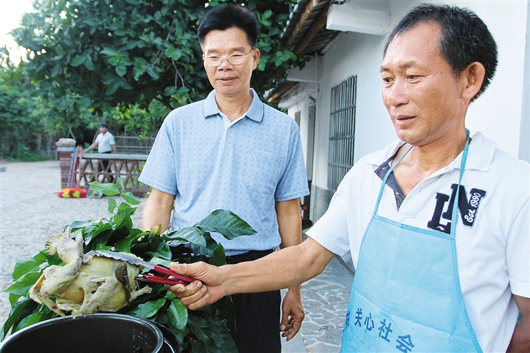 “海南黄皮看儋州,儋州黄皮看大成。”大成镇的黄皮以果大、肉厚、汁多、味甜著称。因为这个缘故,说到正宗黄皮鸡,儋州人一般会推荐大成镇的黄皮鸡。而在大成镇,又以推赛村南吉村民小组的黄皮鸡最有名。