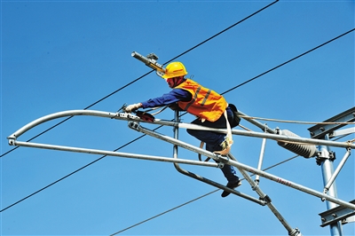 当天海口高温酷暑,施工人员用手机测得现场地表温度48℃。电力接触网上的电线和铁制设备、瓷瓶等都被太阳烤得烫手。面对如此“烤”验,为了使西环铁路年底能顺利开通运营,施工人员依旧坚守在工作岗位上。