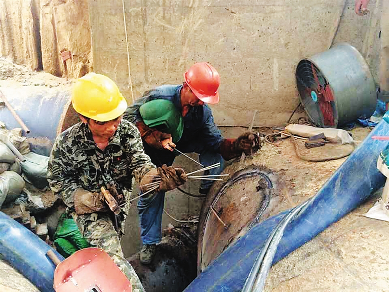发现管道泄漏的当天,为免给更多市民生活造成影响,海口威立雅公司快速反应,迅速组织了包括老何在内的3个抢修班工人赶赴现场,启动了《供水管道抢修应急预案》,由20名工人轮班倒不分昼夜地抢修。但由于漏点位于主干道下,地下管线复杂,作业面受限,大型工程机械无法作业,因此,带水抢修较有难度。考虑时值高峰用水季节,为保障居民正常用水, 企业要求抢修人员克服一切困难, 不到万不得已不停水,边挖掘边加固边排水。