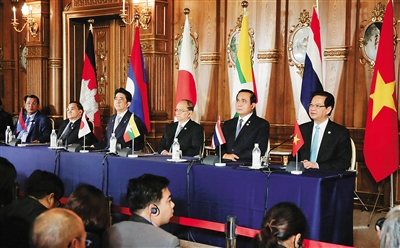 7月4日,在日本东京,(从左至右)柬埔寨首相洪森、老挝总理通邢、日本首相安倍晋三、缅甸总统吴登盛、泰国总理巴育和越南总理阮晋勇出席联合记者会。 第七届日本与湄公河区域国家首脑会议当日在东京举行。日本在会上承诺今后3年向湄公河区域国家提供7500亿日元(约合61亿美元)政府开发援助。新华社/路透