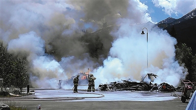 7月3日,在美国科罗拉多州弗里斯科,消防员在坠机现场灭火。 当天,一架救援直升机从弗里斯科起飞时坠毁,造成3人受伤。 新华社/路透