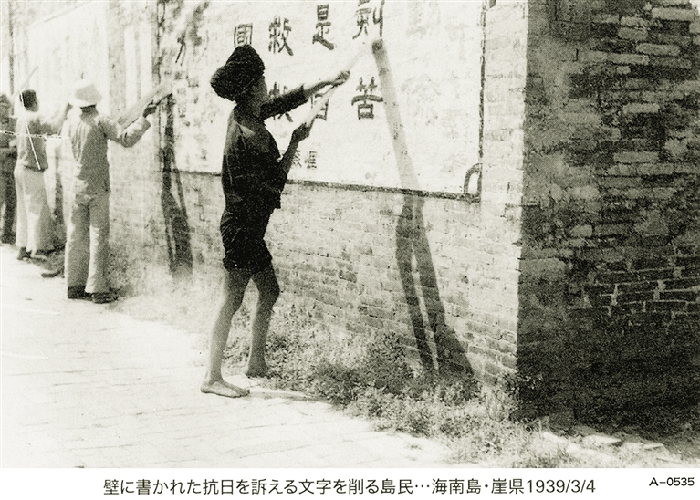 日军占领崖城后,勒令当地老百姓铲掉墙上的抗日标语。
