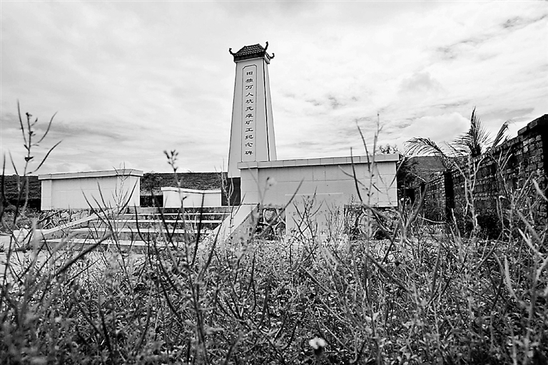 | 1941年农历七月初三,日军因一座桥梁被破坏对群众进行报复,定安县的大河村、后田村、周公村109名村民被日军关在6间房屋中烧死。此纪念碑由国民政府立于中华民国三十四年,碑文记载了屠杀经过。 海南日报记者 苏建强 摄 |