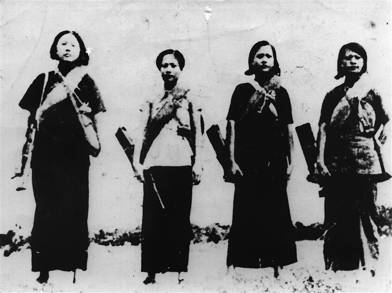 | 琼纵领导机关担负保卫电台任务的女子军排战士。右起:符美娥、林霞、冯月平、符月英。她们在抗战和解放战争中先后牺牲。 |
