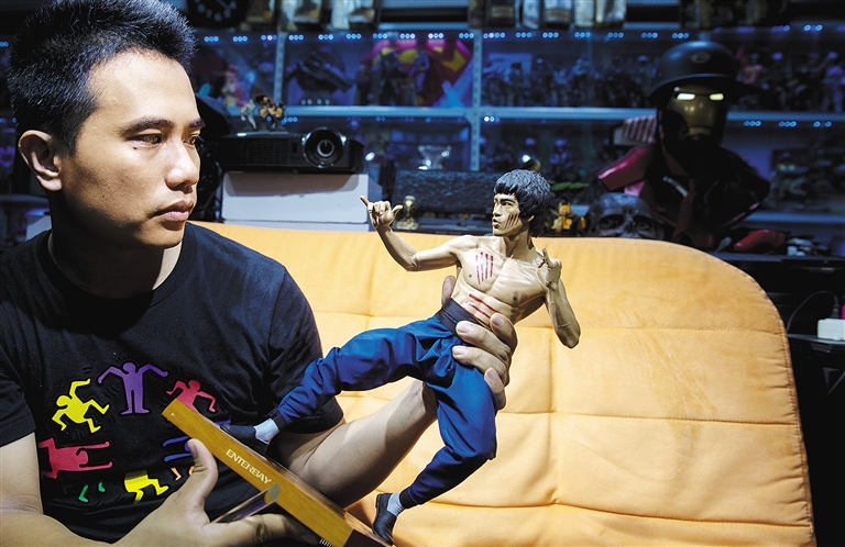 以李小龙为原型的人偶是阿宏的心爱之物。在他收藏的好几套李小龙人偶中,有一些都是限量版,“这些人偶都是香港的公司生产的。有一次限量版在北京开售,还是托北京的朋友帮我到现场排队买到的。”