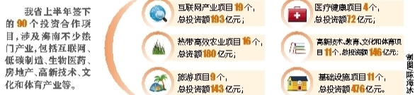 我省上半年签下的90个投资合作项目,涉及海南不少热门产业,包括互联网、低碳制造、生物医药、房地产、高新技术、文化和体育产业等。