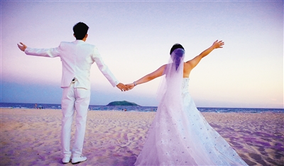 据统计,2012年,来海南拍摄婚纱的游客接近20万对,而到了2014年底则突破了25万对。海南的高星级酒店几乎都配置了相关的蜜月房和特色婚房,还推出了很多婚庆旅游组合式的产品。