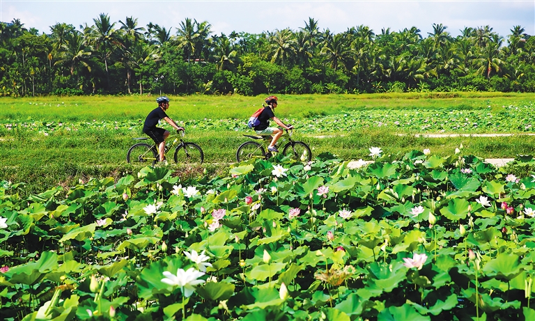 潭门镇的美雅村里,穿过小巷的凉风送来阵阵花香;塔洋镇的七星伴月景区里,人们骑着自行车穿行于搭建在硕大鱼塘之上的木栈道上;嘉积镇的北仍村里,人们正漫步在槟榔树下的林荫道上……分布于各个小镇的美丽乡村,对于来自大城市的孩子们来说,一切都会是那样的新鲜。