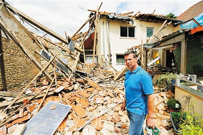 德国美因茨附近的弗拉默斯海姆7日夜间遭遇强风天气,造成一些房屋及设施受损。图为8日,一名当地居民站在自己损毁的房屋前。