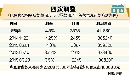 住房公积金贷款利率8个月内4次下调,对于购房者来说,其最大好处就是贷款利息和月供减少了,以住房公积金贷款额50万元、贷款30年、等额本息还款方式为例,降息后借款人每月少还288元,30年总共减少利息支出103680元,相当于省下一部小汽车的钱。