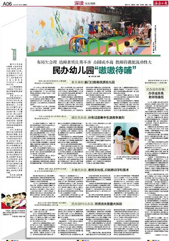 近日,本报记者就民办幼儿园的发展现状进行调查,在走访了城区和农村多家不同层次的民办幼儿园,并走访了包括一些新建的公办幼儿园和公办民营模式幼儿园后,对比发现目前民办幼儿园发展存在诸多硬伤,譬如城区民办幼儿园规划不合理,过度集中的地区产生恶性竞争,幼师素质良莠不齐;农村民办幼儿园师资力量水平普遍低下;全省专业幼师缺口大,待遇低,流动性大等等问题。