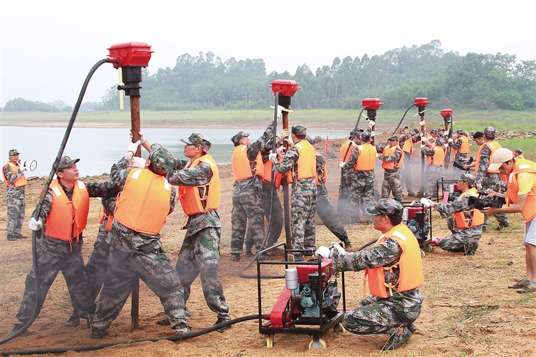 7月10日,我省举行松涛水库应急抢险救灾综合演练,松涛灌区管理分局200多名年轻抢险队队员,开展了冲锋舟水上搜救、水上营救、转移被困群众、后勤安置和坝体管涌抢险、坝体滑坡抢险、启用移动电源启闭闸门、升降灯等科目的模拟抢险演练。图为抢险队员举行坝体滑坡打桩加固演练。