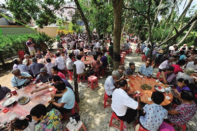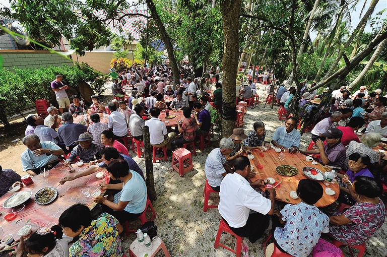 据记载,“千叟宴”始于清康熙五十二年,当年康熙皇帝在阳春园宴请全国70岁以上老人2400余人,因而被后人称之为“千叟宴”。2011年起,文昌市重现了这一传统宴会,虽与当年的皇家宴会无法相提并论,但一道道传统的文昌菜,也让老人们吃在嘴里,乐在心里。