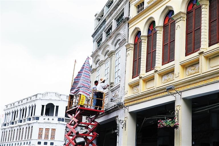 7月10日,在海口市骑楼老街,工人正在对博爱北路街景街廓进行修缮。据了解,博爱北街景整治工程“修旧如旧”,工程包括骑楼建筑立面修缮、“老字号”挖掘、沿街景观完善等方面。完工后,“聚合号”等老字号将重现,还原出老海口的繁华风貌。本报记者 张茂 摄