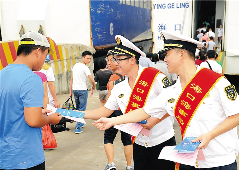 图为海南海事局海事人员在海口港码头向过海旅客宣传海洋文化和航运知识。