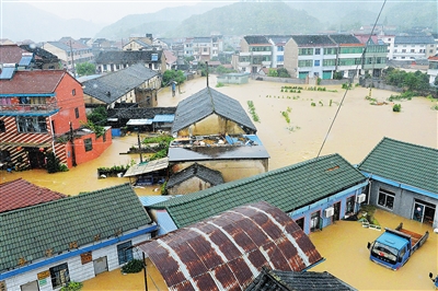 7月11日,浙江绍兴上虞区下管镇积水严重。 当日16时40分,强台风“灿鸿”在浙江舟山普陀区朱家尖登陆,强降雨导致浙江中东部地区多个城市出现内涝。 新华社发(袁云 摄)